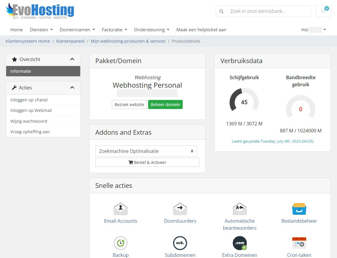 e. Navigeer naar Actieve producten > jouw webhosting pakket