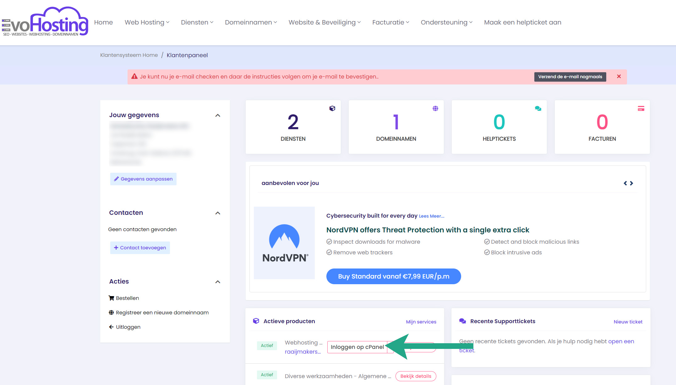 Login met uw gegevens bij onze website en navigeer naar Actieve Producten en klik op inloggen cPanel (zie groene pijl)