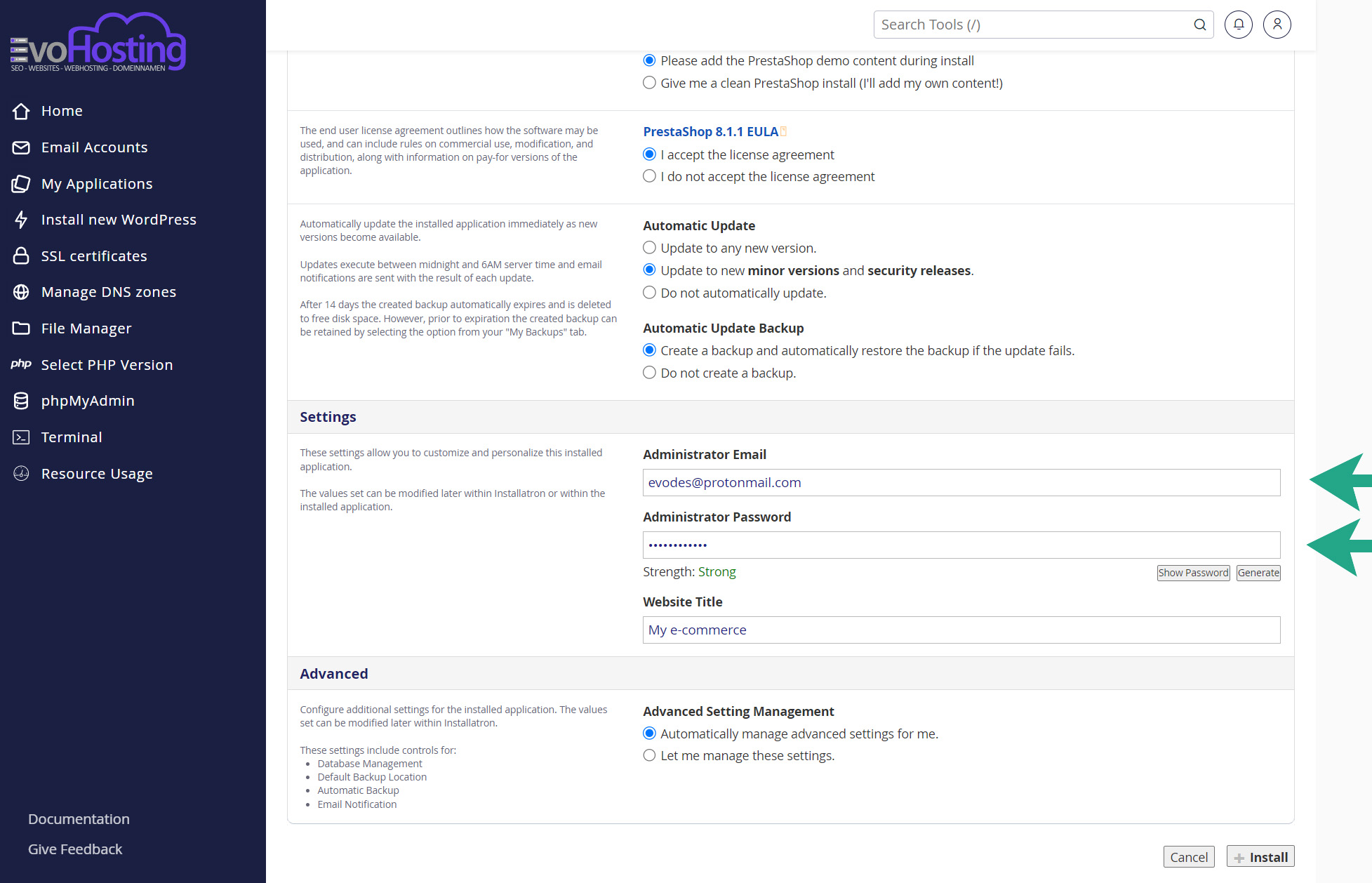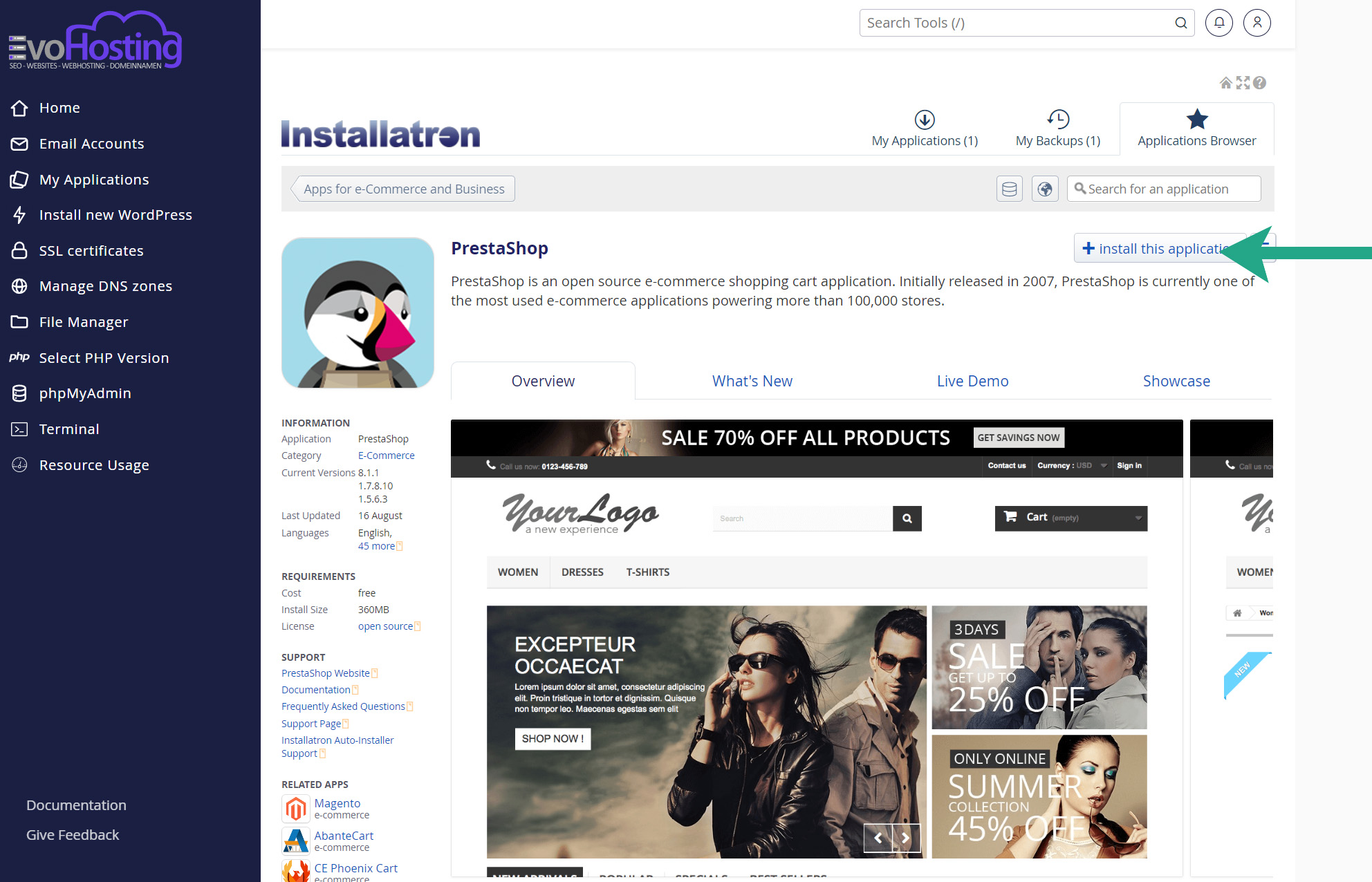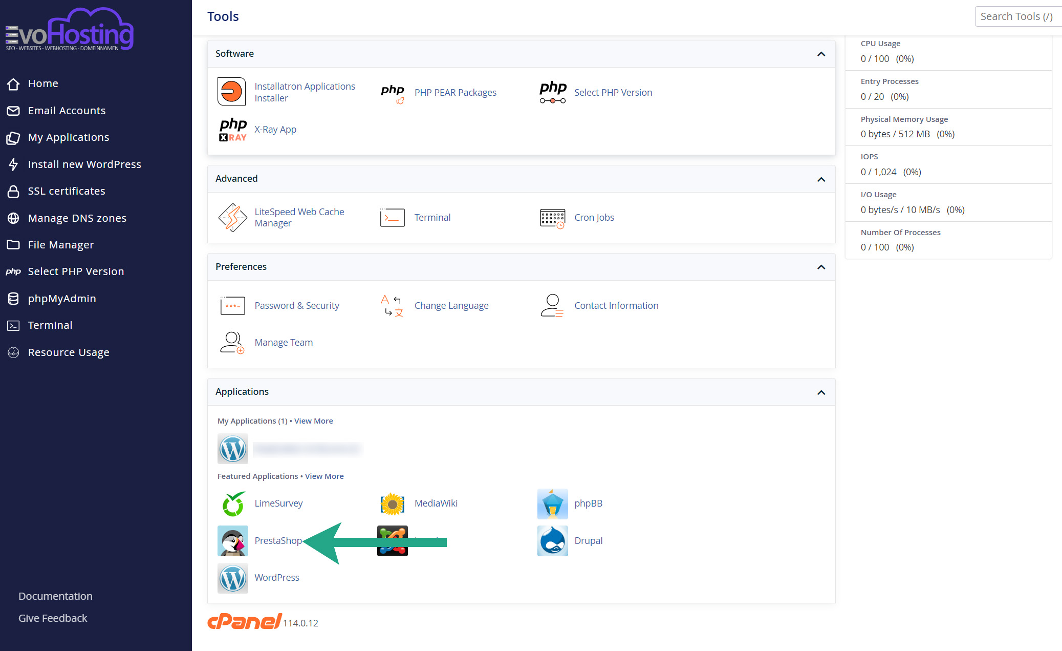 Aangekomen bij jouw cPanel beheersysteem scroll je helemaal naar beneden tot je uitkomt bij Applications (zie groene pijl) en klik op Prestashop